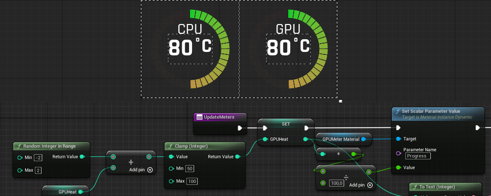 The UMG widget itself has a single looping animation and loads of smaller widgets that uses their own materials and logic to create movements. For instance, there’s a “heat” widget that simply randoms between adding -1, 0 and 1 every second and feeds the value to a circular progress material: